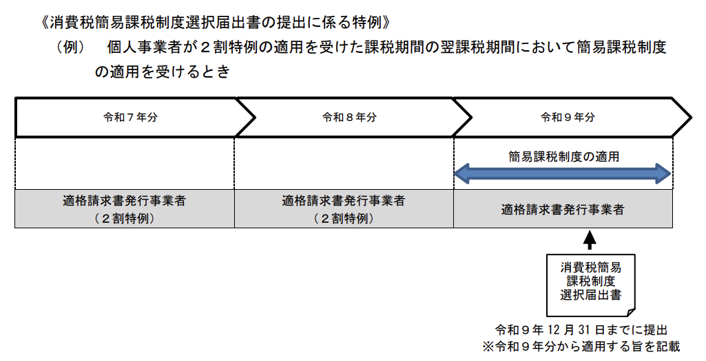 この場合、本来であれば令和8年中に「簡易課税制度選択届出書」を提出しておく必要がありますが、提出時期の特例により、令和9年中に「簡易課税制度選択届出書」を提出すれば良いということになります。
